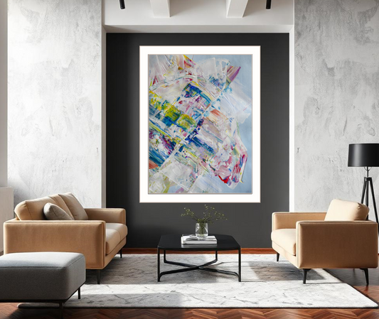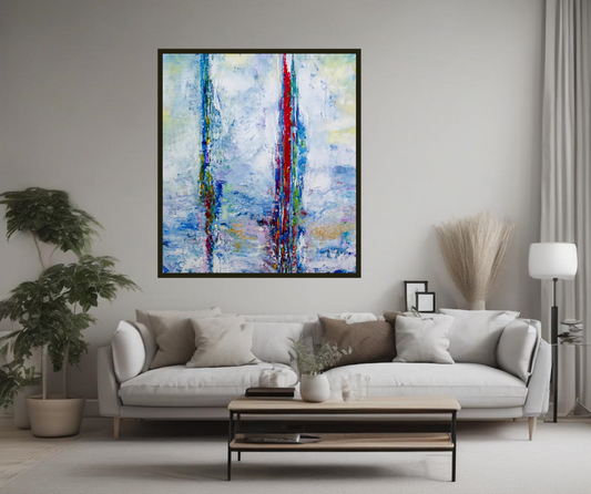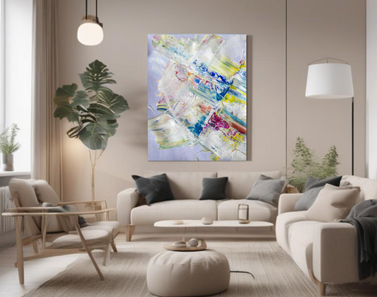• Abstract painting with a mix of blue, yellow, and white colors.