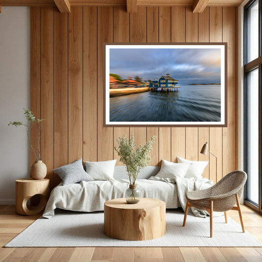 • Fine art photo of a dock from below extending toward the sea horizon, evoking an infinite path and depth, suited for minimalist and romantic styles