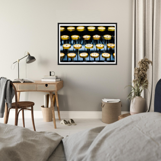 • This evocative photograph reveals a stunning golden keyboard, its keys worn smooth by the countless words and narratives crafted over time. Bring a touch of elegance and inspiration to any space. Poster.