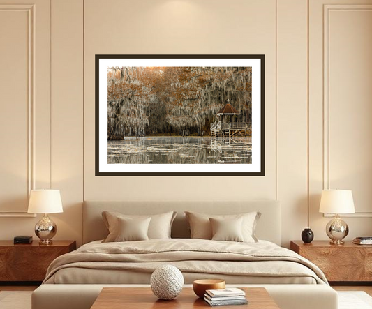 • “Standing Out” captures a peaceful blue boat in contrast with black-and-white trees and water reflections. A soulful piece for minimalist and romantic homes.