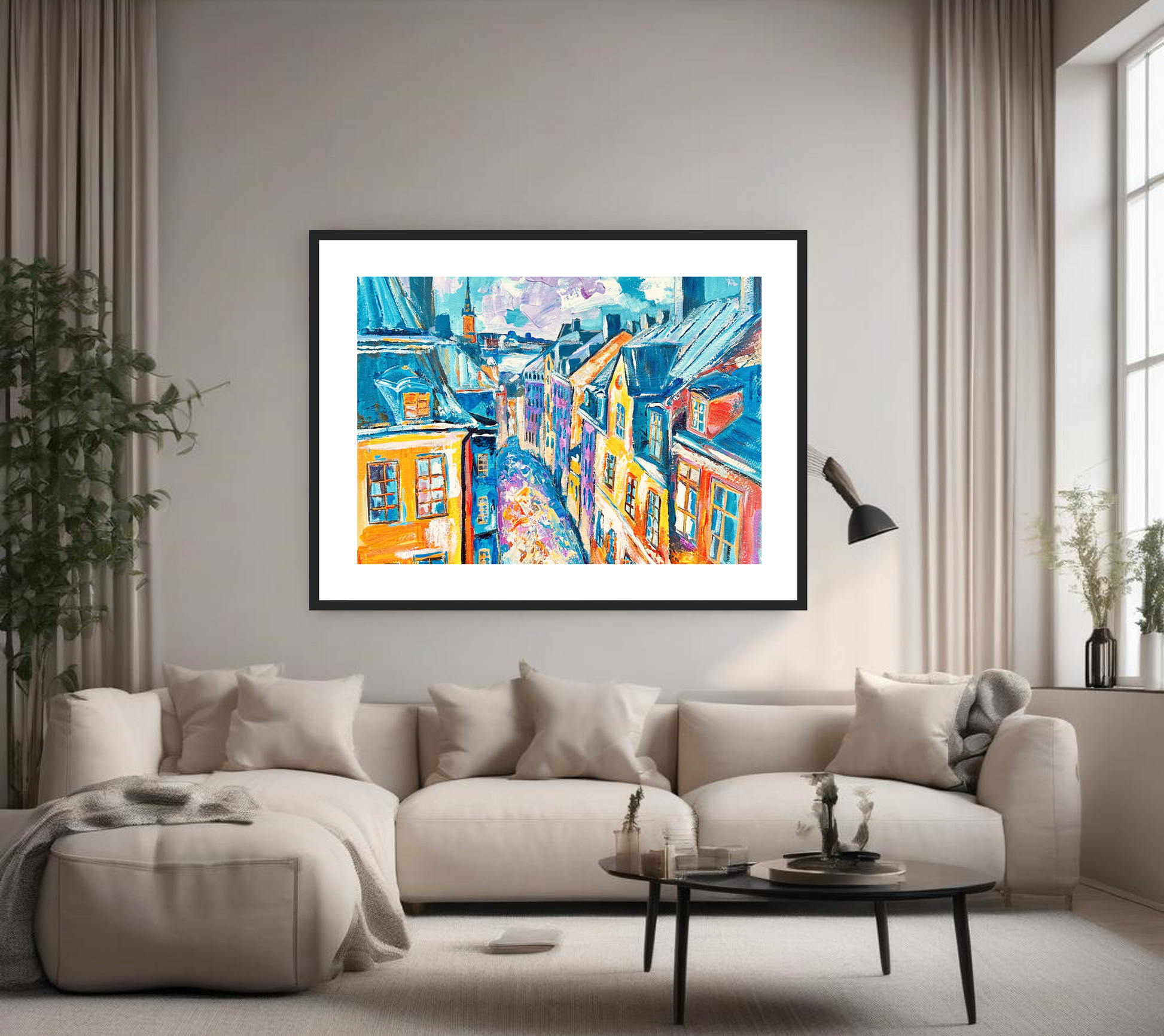Gamla Stan captures the vibrant spirit of Stockholm’s Old Town in a symphony of bold color and expressive brushstrokes. Bright blues, warm yellows, and soft purples dance across historic rooftops and winding cobblestone streets, creating a lively, dreamlike portrait of one of Europe’s most enchanting districts.